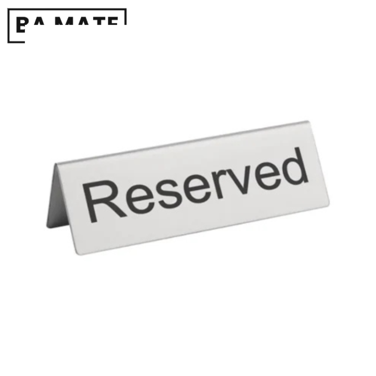 Reserved Sign Tent, Stainless SteelMaintain a polished and professional atmosphere with the Reserved Sign Tent, Stainless Steel. Perfect for restaurants, hotels, or event spaces, this sleek and durable sign is an essential tool for marking reserved tables, ensuring clear communication while adding an elegant touch to your venue’s décor. Crafted from premium stainless steel, this sign combines functionality with a modern aesthetic, making it the perfect solution for any upscale setting.Key Features: